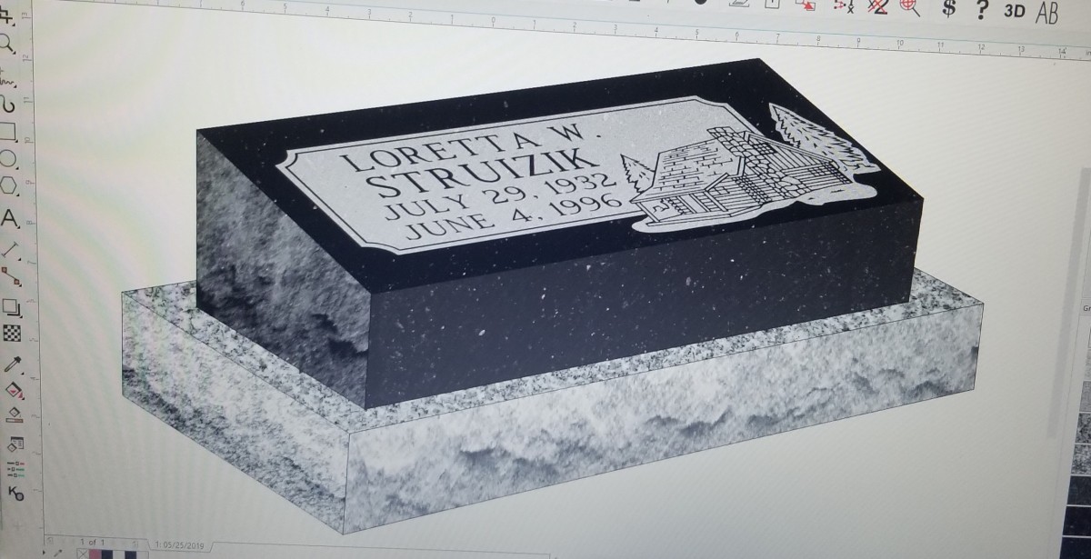 Using state of the art CAD design systems you are able to create the most unique and well thought out memorial for your families monument.Our design system is one of the finest available and gives our customers the best available design capabilities while offering over 12,000 memorial designs and over 90 alphabets. Choosing your loved ones monument is not an easy decision, with this design system it gives our customers more of an active hands on part in designing their families memorial. Your imagination is the only limit to the creativity we can obtain. Some of the customized designs range from an aerial farm scene of your own farm to your own pampered pet.