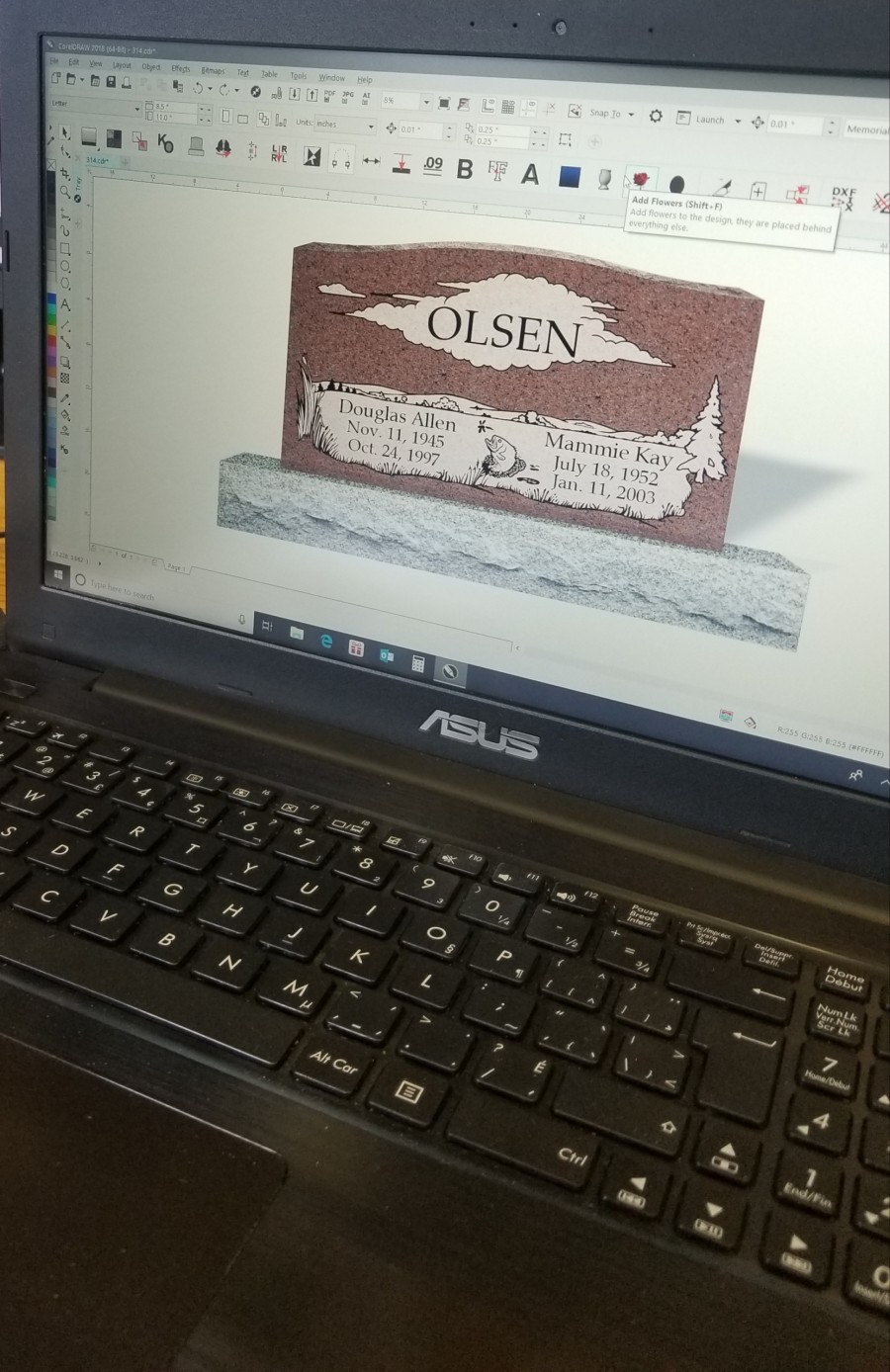 If you cant find what you are looking for in our vast collection of monument designs there are also several ways to include one of a kind personal artwork onto your memorial. One option is our new Corel draw tablet system. We are able to take personal items or photographs and replicate them to a CAD design in house. You will also receive a full color proof to ensure your personal touch to your loved ones monument is exactly what you would expect.